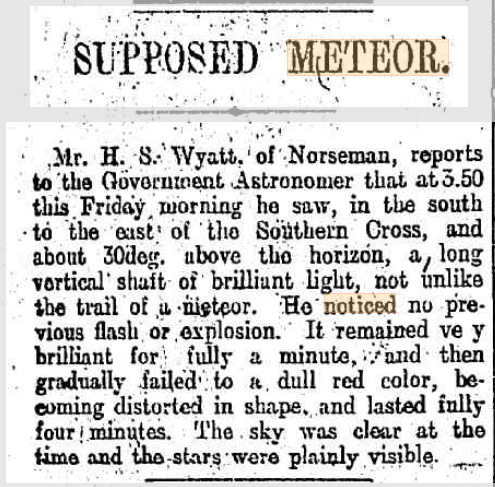 UFO: W.A. Norseman, May 1903 July 16, 2022 Leave a Comment on UFO: W.A. Norseman, May 1903 Posted in Sighting Most likely a meteor. Sources & Links UFORA Research Digest, November 1991