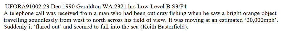 UFO: W.A. Geraldton, December 1990 July 23, 2022 Leave a Comment on UFO: W.A. Geraldton, December 1990 Posted in Sighting Another at sea sighting Sources & Links UFORA Research Digest, November 1991