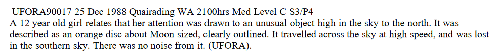 UFO: W.A. Quairading, December 1988 July 23, 2022 Leave a Comment on UFO: W.A. Quairading, December 1988 Posted in Sighting Sources & Links UFORA Research Digest, November 1991